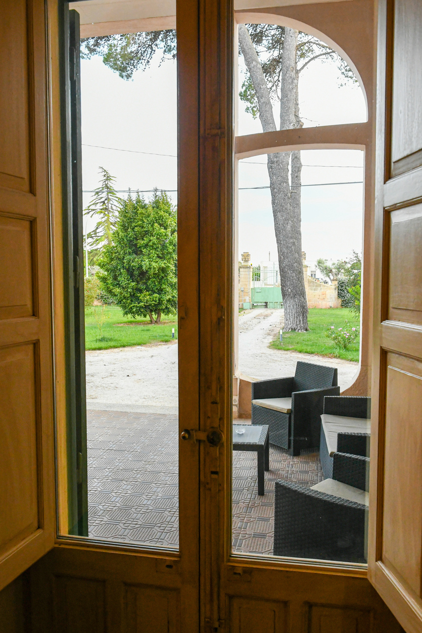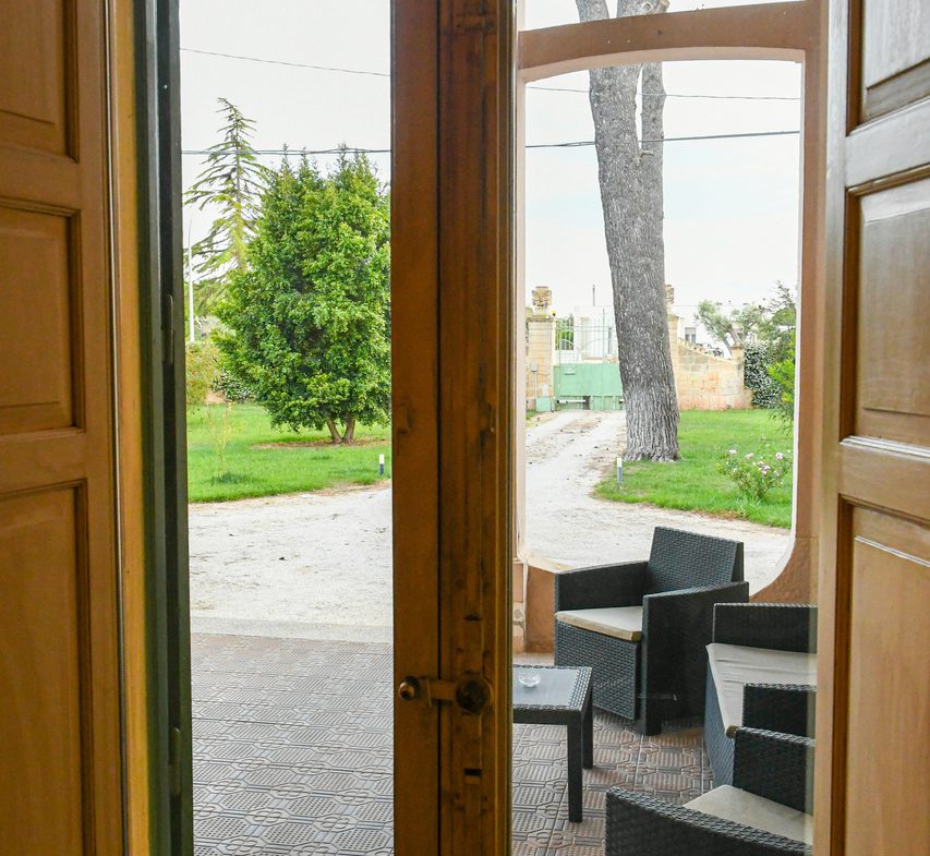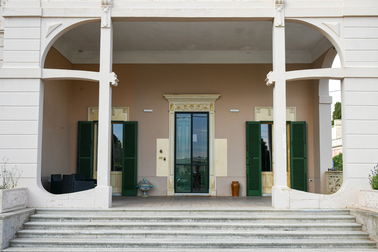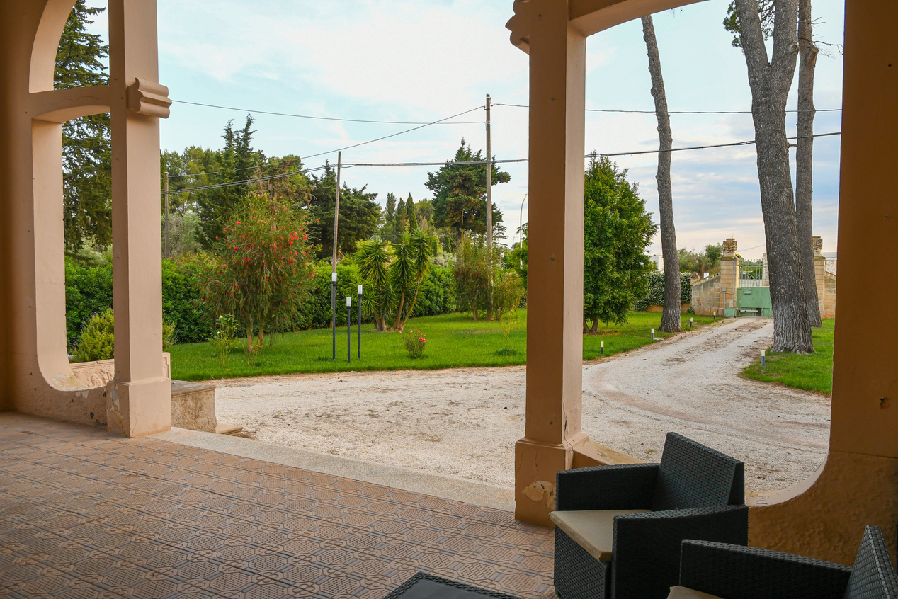 Il prospetto principale rappresenta pienamente lo stile liberty salentino caratterizzato da linee armoniche e dettagli scolpiti nella pietra leccese, materiale simbolo della storia del Salento. La scenografica scalinata d’ingresso conduce al portico incorniciato da colonne e decorazioni di altri tempi, offrendo uno spazio perfetto per il relax nella quiete della campagna.
