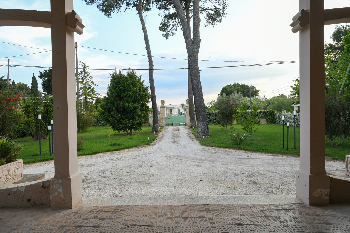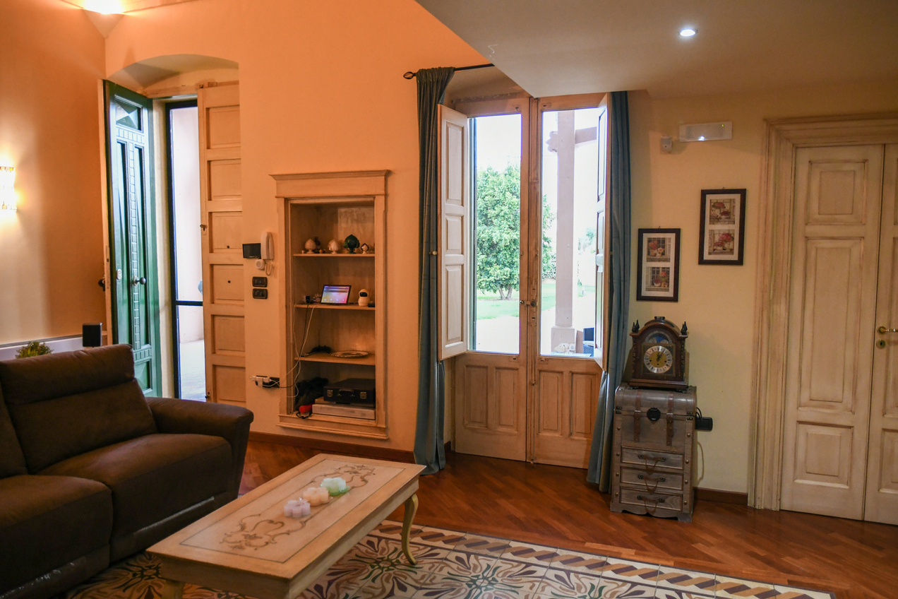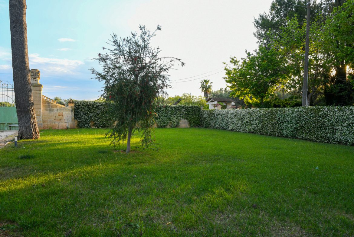 Il prospetto principale rappresenta pienamente lo stile liberty salentino caratterizzato da linee armoniche e dettagli scolpiti nella pietra leccese, materiale simbolo della storia del Salento. La scenografica scalinata d’ingresso conduce al portico incorniciato da colonne e decorazioni di altri tempi, offrendo uno spazio perfetto per il relax nella quiete della campagna.