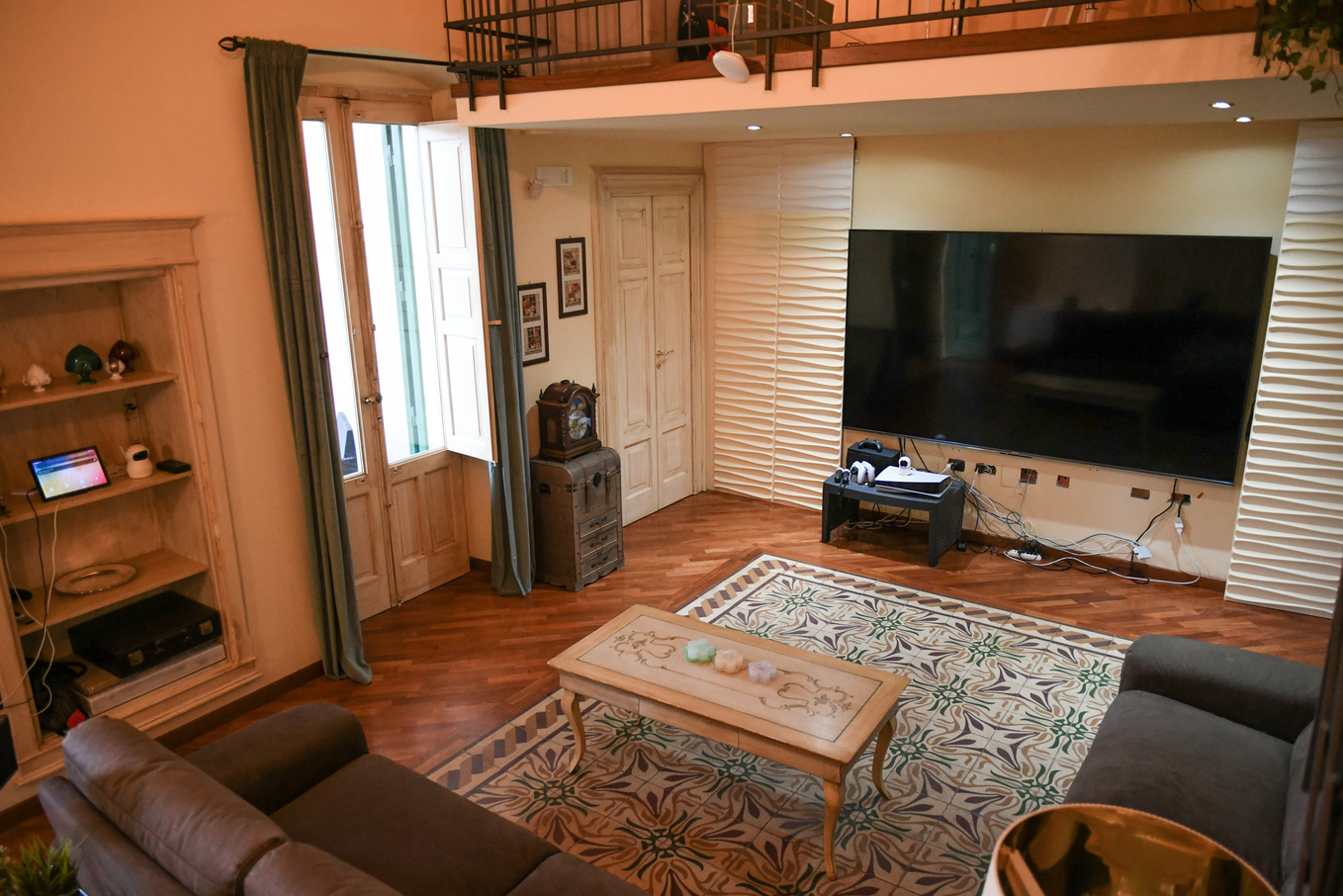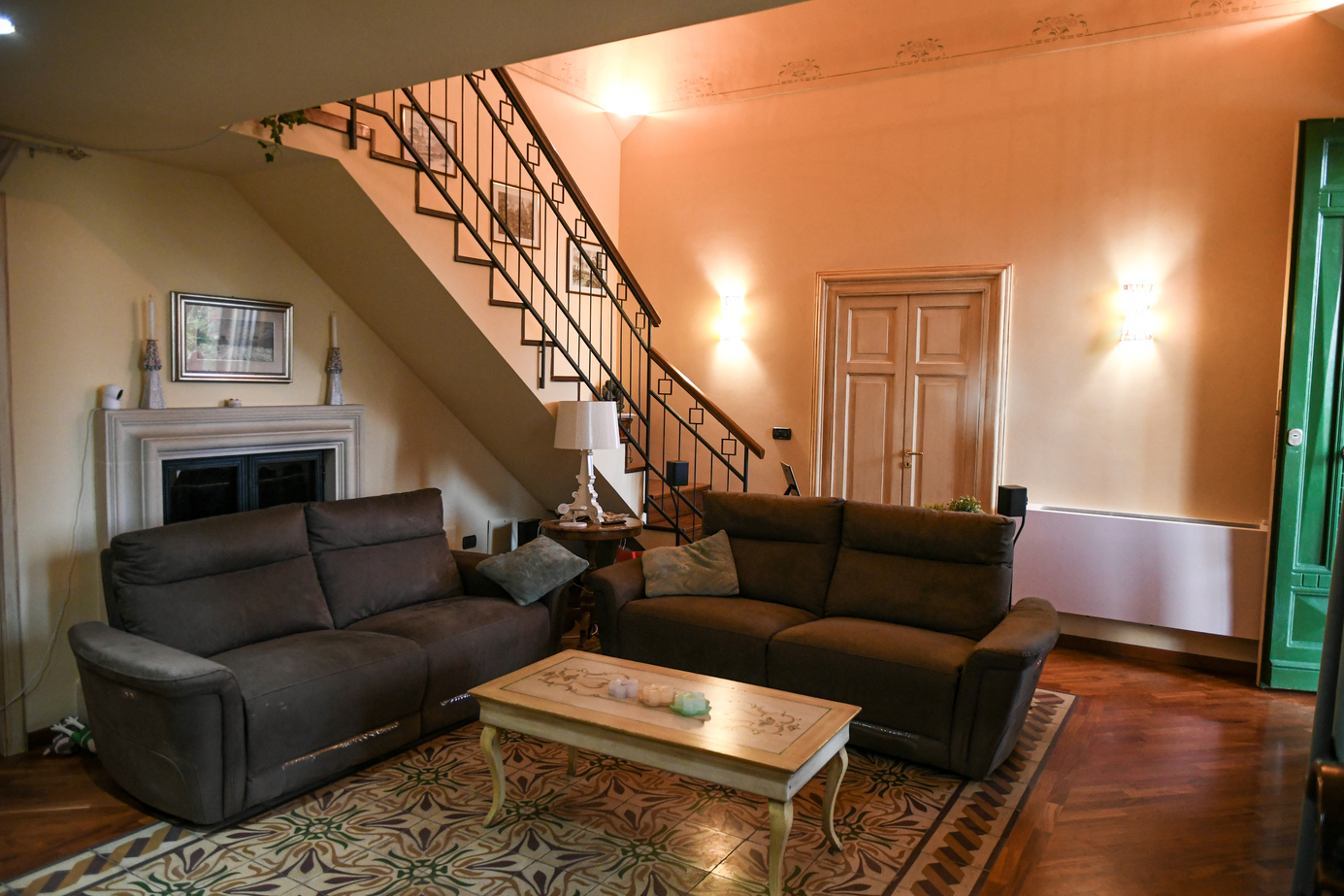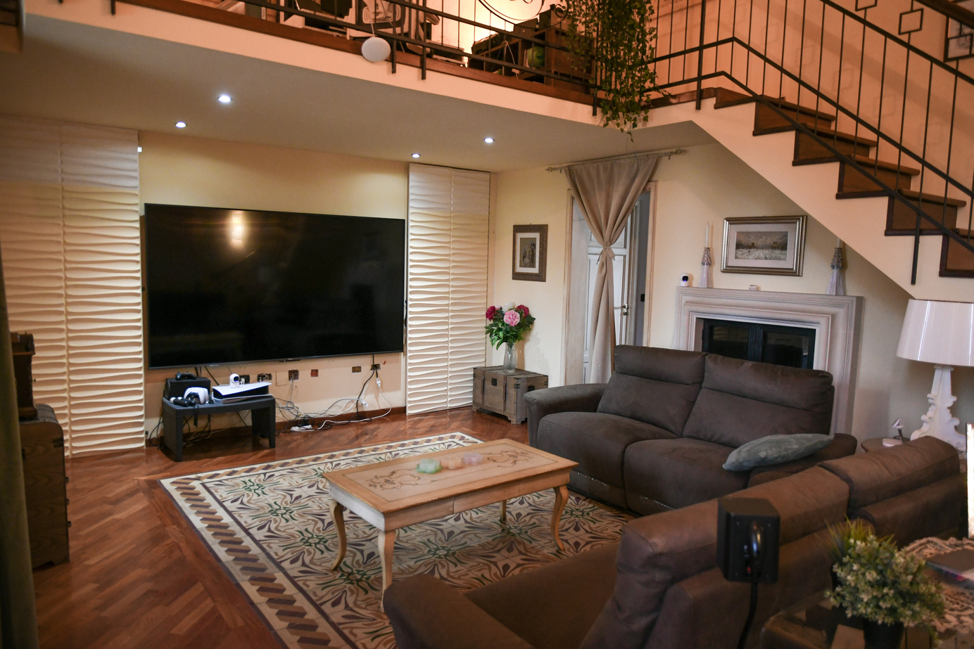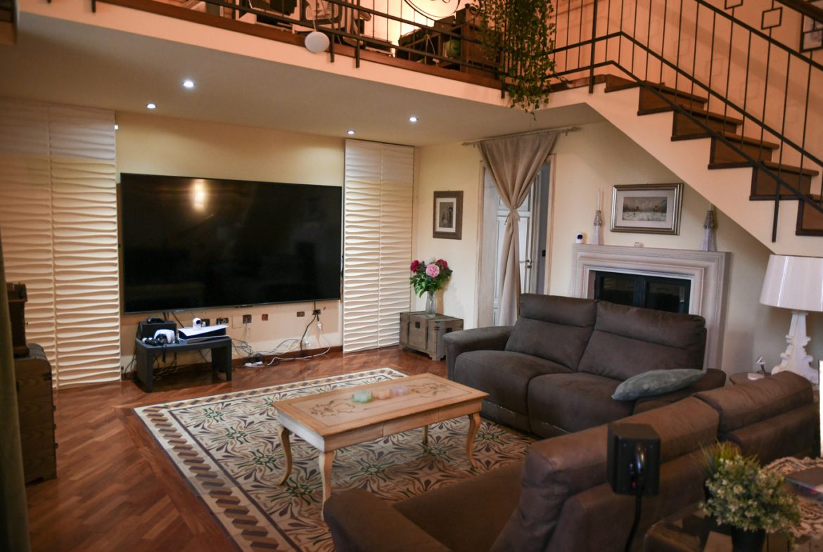 All’interno, un ampio soggiorno accoglie con eleganza. I pavimenti in legno nobile, il raffinato camino e la scala in ferro battuto lo rendono lo spazio ideale per vivere la casa grazie anche alle grandi vetrate che filtrano la luce enfatizzando la cura dei dettagli.