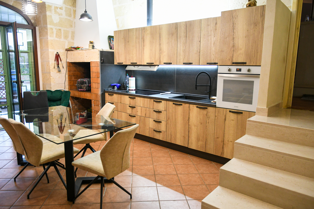 L’accogliente cucina è uno spazio conviviale e luminoso. Le linee eleganti e moderne si uniscono perfettamente con la struttura originaria della villa, creando un ambiente dove passato e presente si incontrano.